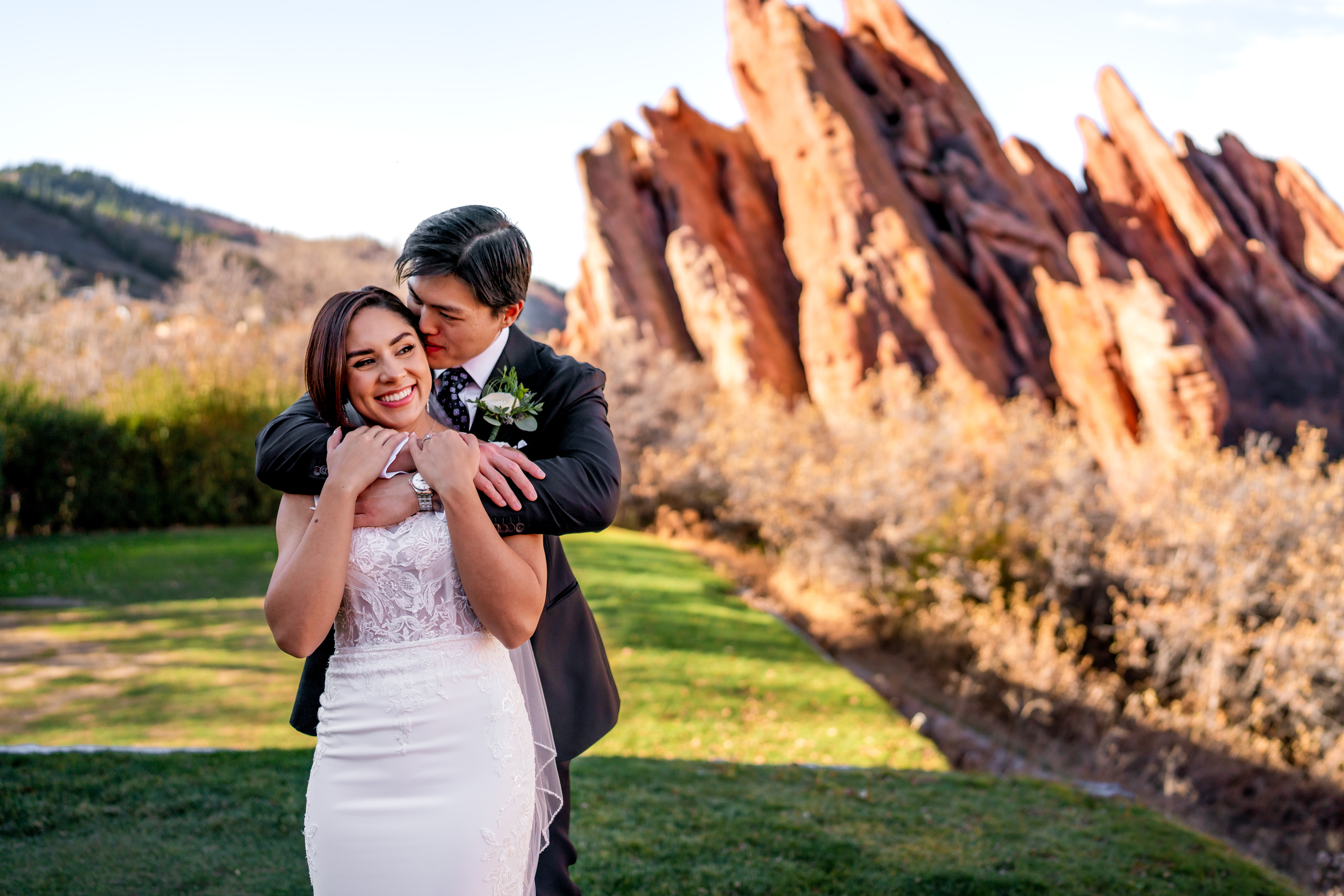 As your wedding photographer at Arrowhead Golf Course, I’ll make sure we get outside for some sunset golden hour photos, with that soft light looking so gorgeous as it falls across the sandstone rocks, the ideal backdrop for a big kiss for the camera!