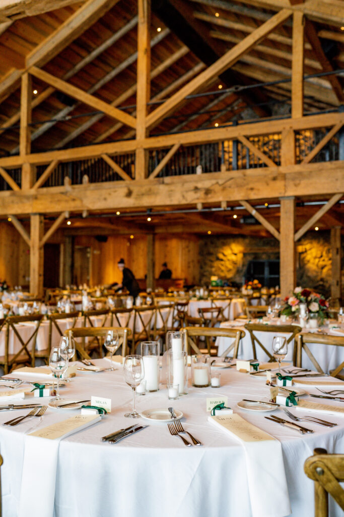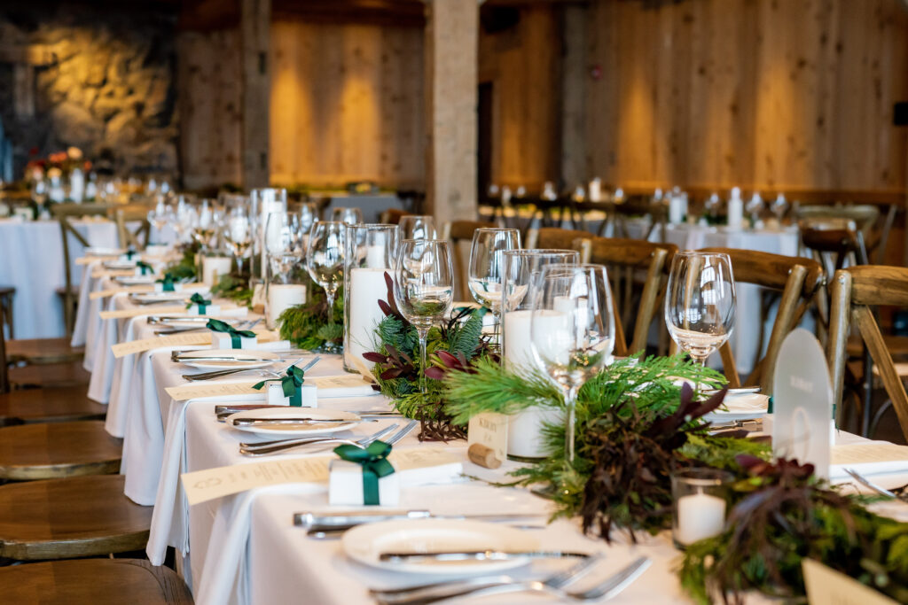 Broad Axe Barn is one of the stunning reception spaces, featuring 25-foot-high ceilings and hand-hewn beams for a rustic yet elegant feel. Alternatively, the Timber house offers an exceptional celebration space with tall, wraparound windows that flood the room with natural light and provide panoramic views of the Colorado mountains.