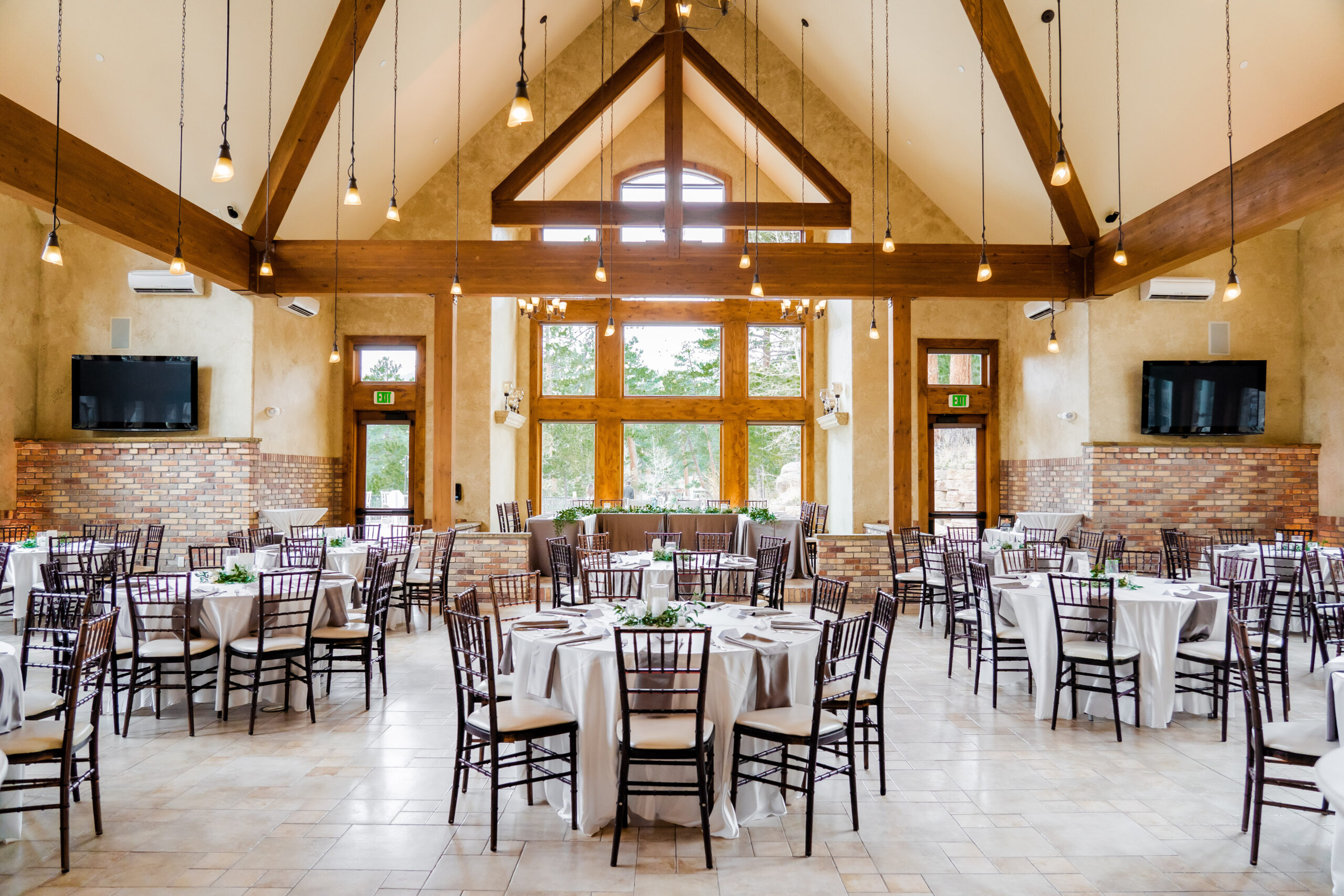Or, the Celebration Space is a stylish indoor option for a ceremony or your reception, in brick and stone design, with grand balconies, floor-to-ceiling windows, and two large fireplaces.
