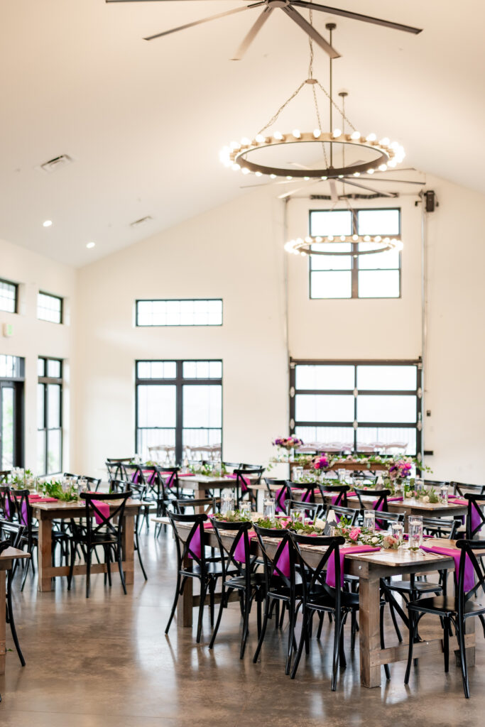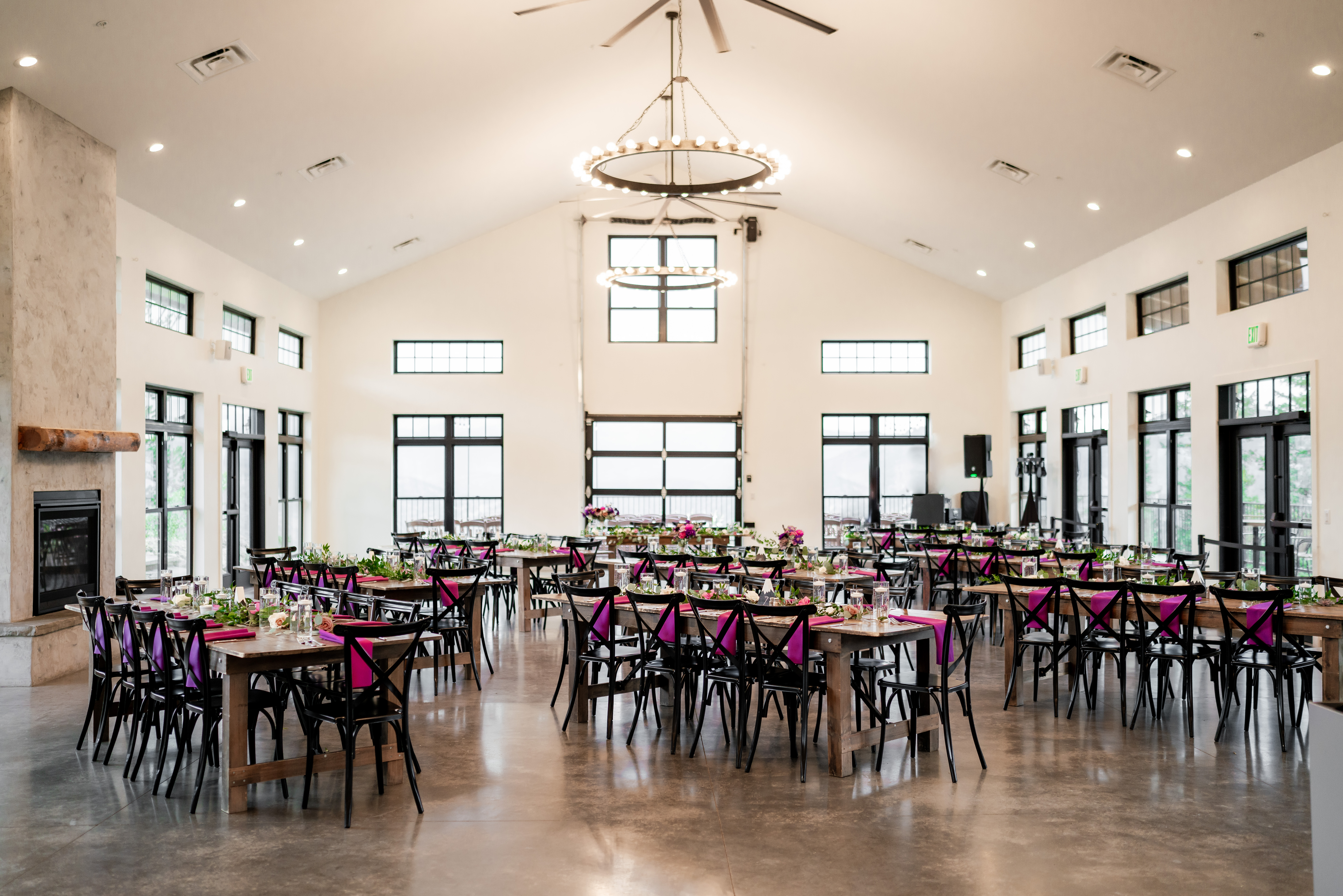 For your reception, make a grand entrance by walking down the loft staircase into The Great Hall, an elegant, contemporary space that invites personalization. The hall features high ceilings, pristine white walls, a statement chandelier, and large windows that flood the room with natural light — great for wedding photos at North Star Gatherings!